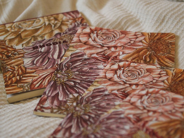 Watercoloured flowers illustrations thought up and painted for the Rhodia's Orange Botanique collection.